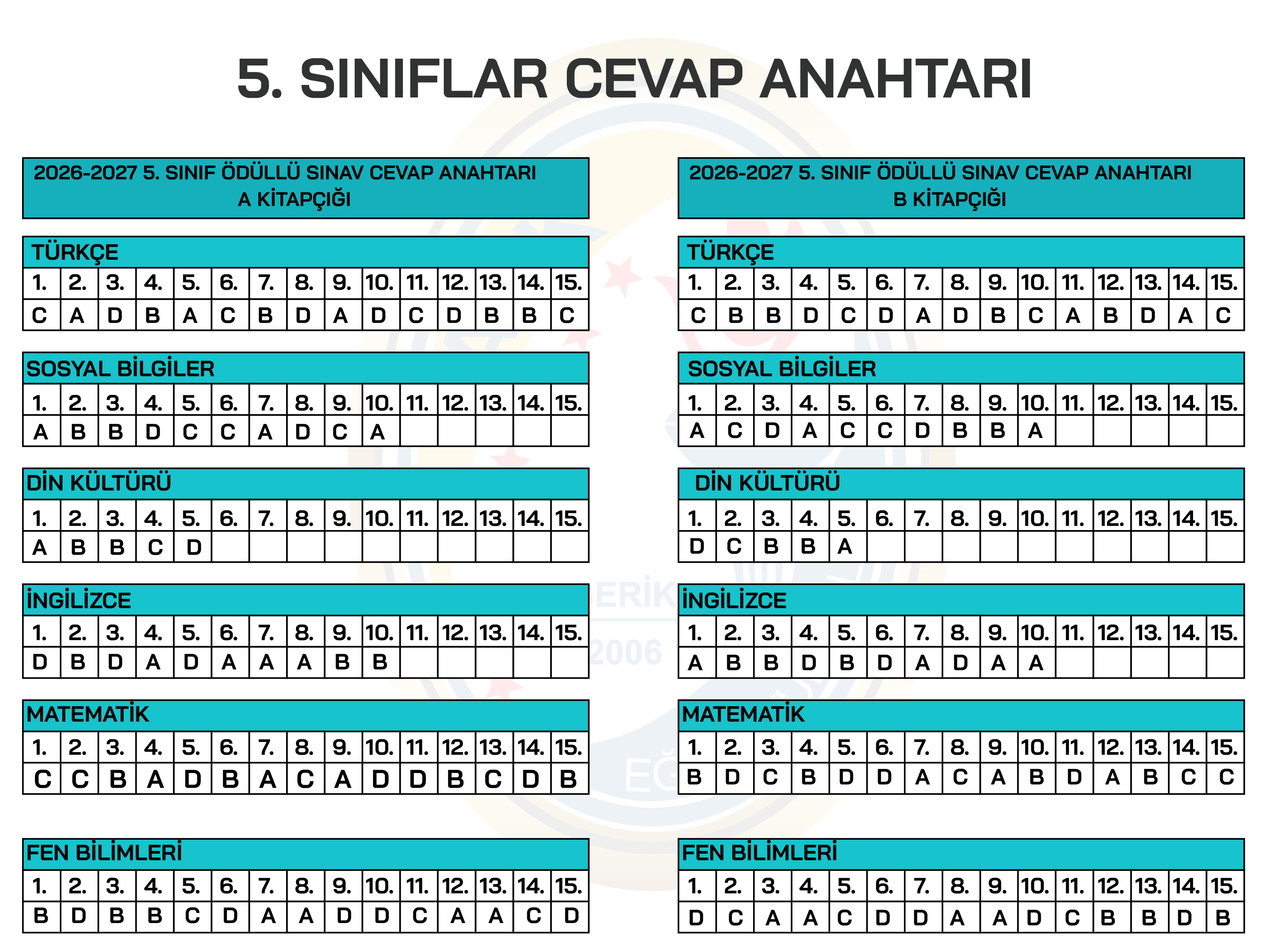 5. SINIF ÖDÜLLÜ SINAV CEVAP ANAHTARI