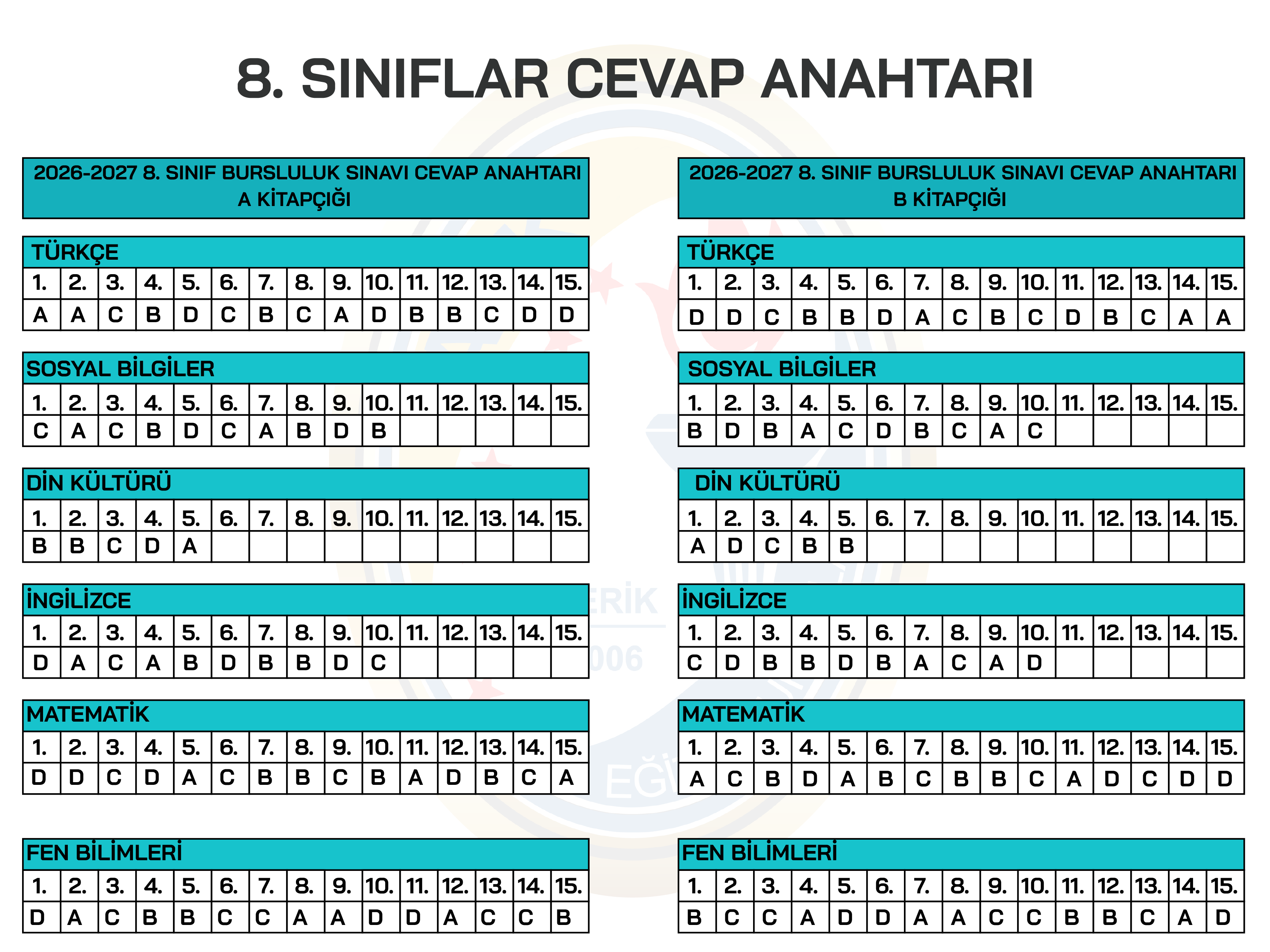 8. SINIF BURSLULUK SINAVI CEVAP ANAHTARI